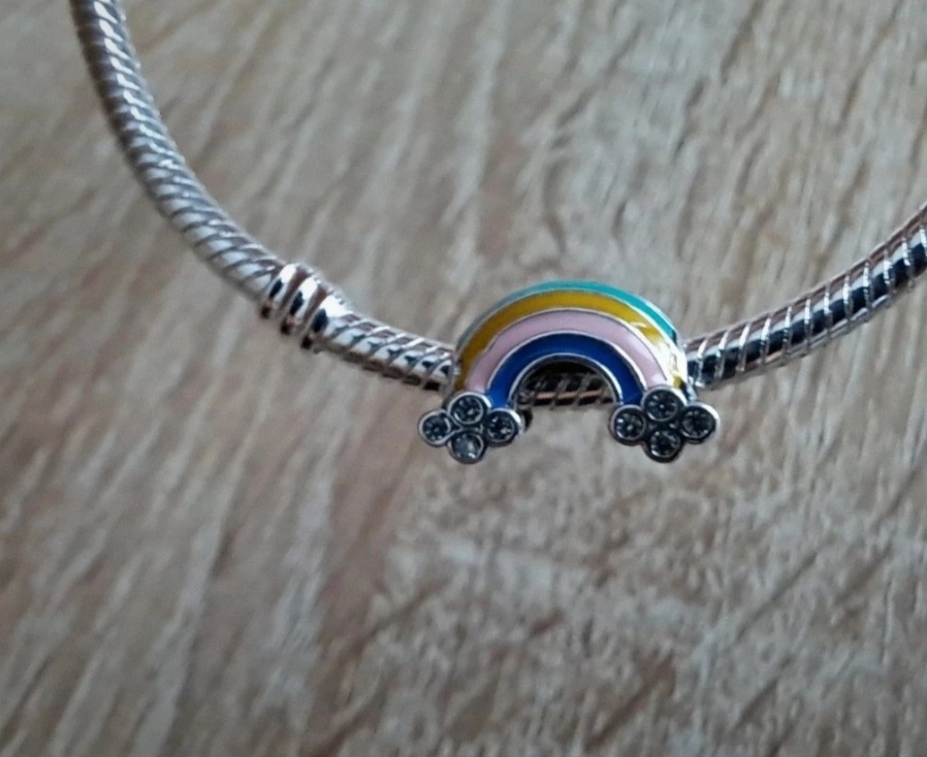 Krásny prívesok korálka v tvare pastelovej dúhy s dvoma obláčikmi s trblietavými zirkónmi.