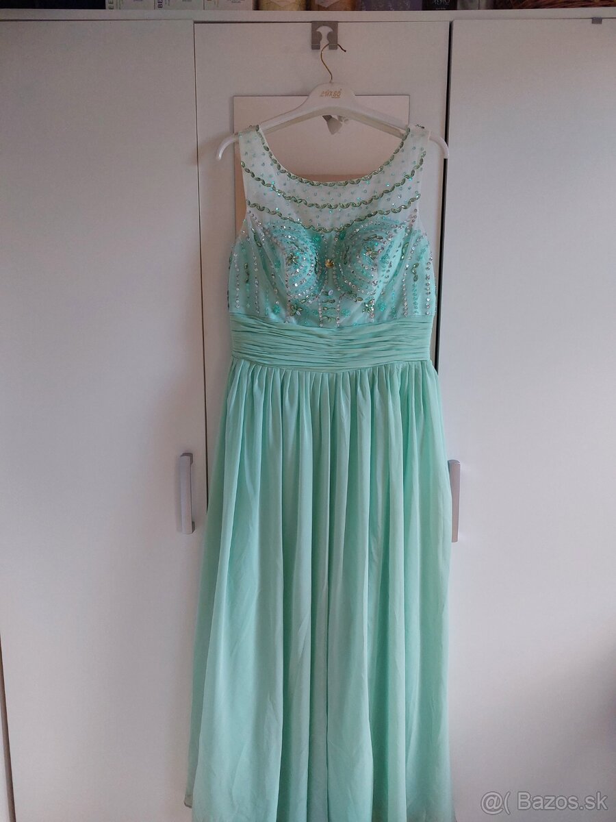 Sú 2x oblečené a nepoškodené, farba je bledučko mentolová ani to poriadne nejde odfotiť, sú nádherné. Zapínanie je na zips a vzadu je snúrka na mašlu. Veľkosť L. Opravé v čistiarni.