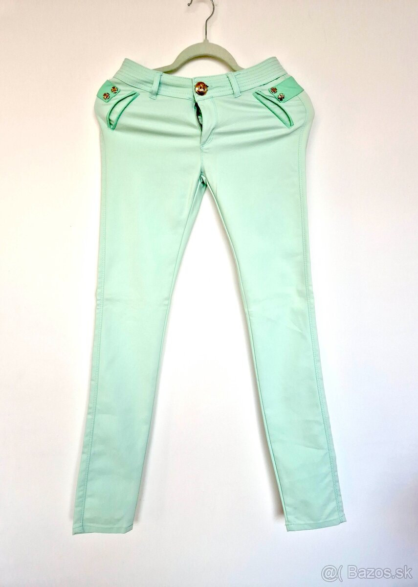 Dámske jemné nohavice sviežej jemnej zelenej farby so zlatým metalickým zdobením na zadnej časti. Výrazne elastické. Číslo W27. Zapínanie na zips a gombík. Nový tovar. Cena je bez poštovného, pozrite si aj ostatnú moju ponuku.