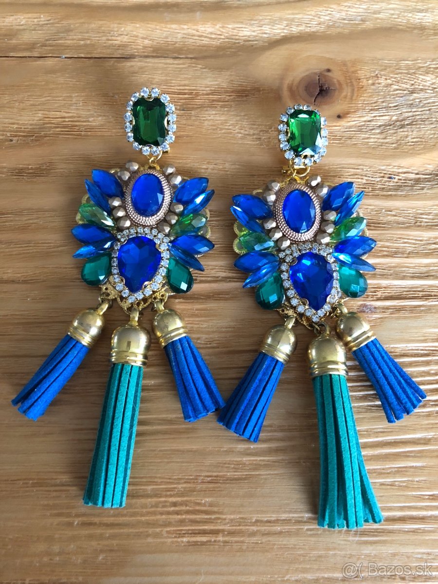 Predam krasne nove smaragdovo zeleno- modre strapcove nausnice znacky Elisha Fox rucne robene. Dlzka nausnic cca 13 cm, Sirka cca 4,5 cm. Cena nausnic 20€.