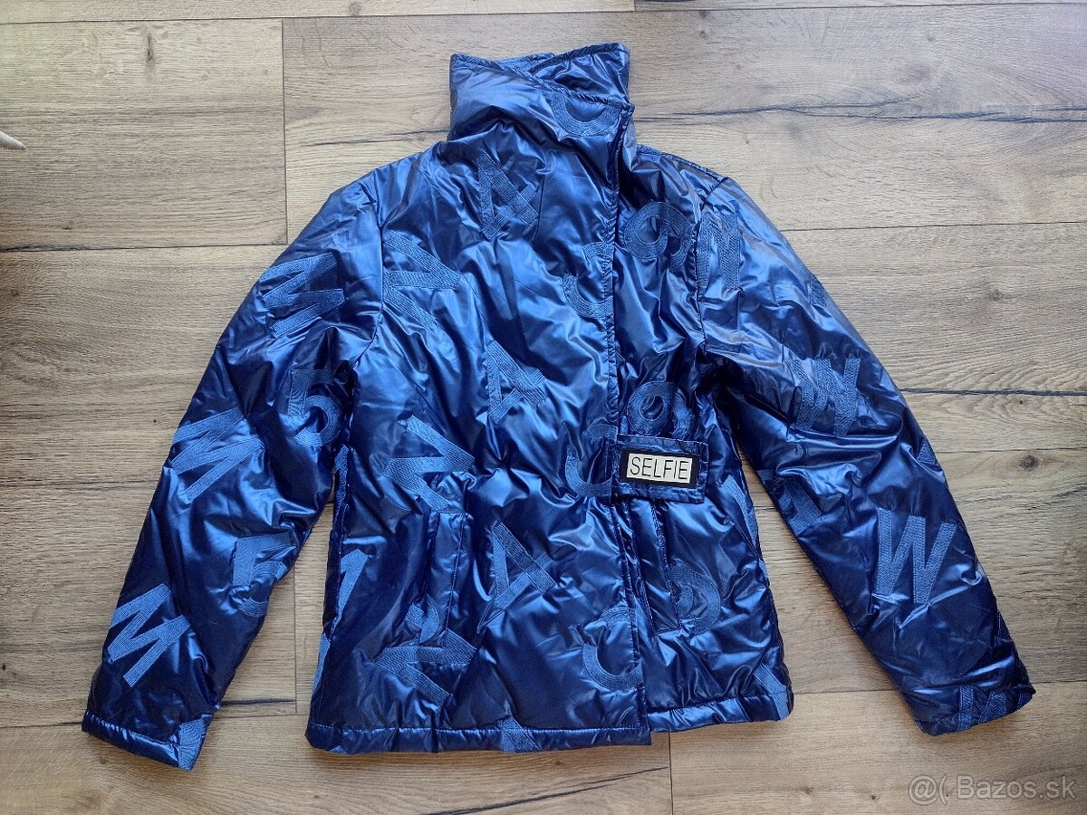 Nová prechodná vetrovka bez visačky, metalická, ozvláštnená vyšitými písmenami, kupovaná v butiku. Krásne vyzerá s bielou košeľou.