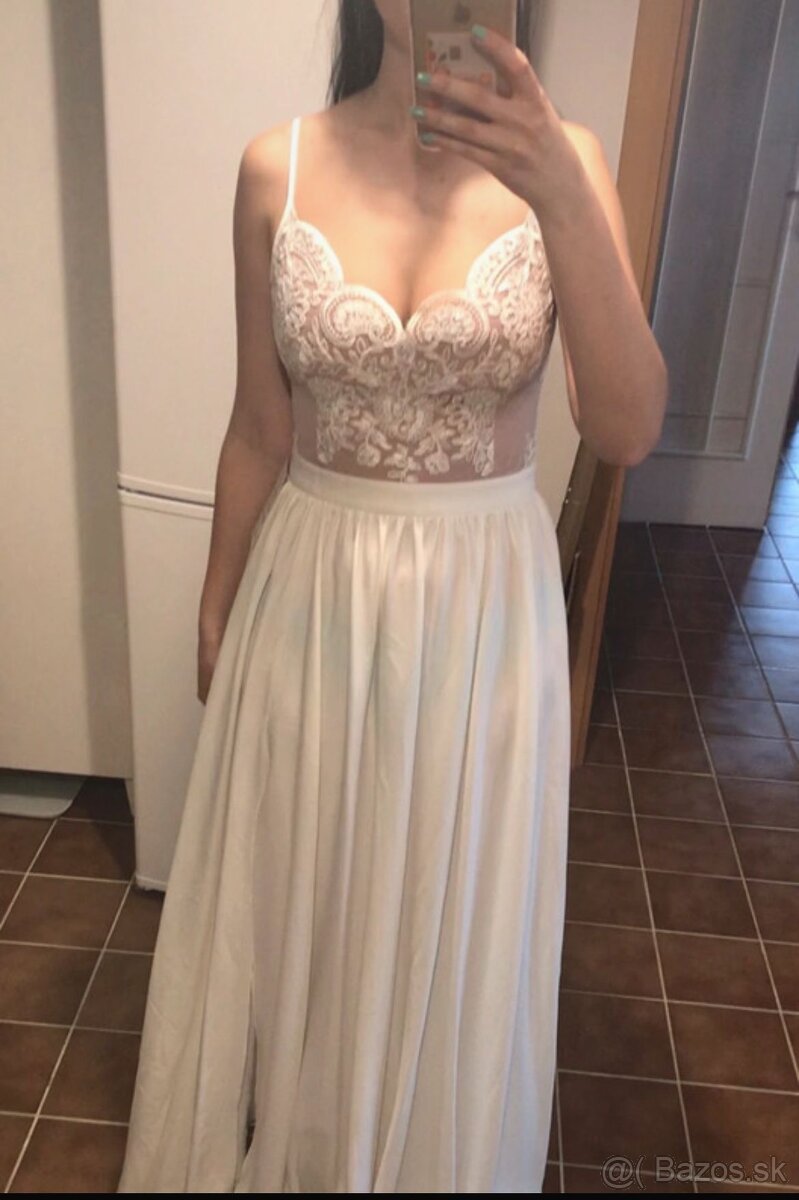 Poprsie max 75B. Dĺžka šiat po zem pri výške postavy 170cm. S rozparkom. Raz oblečené.