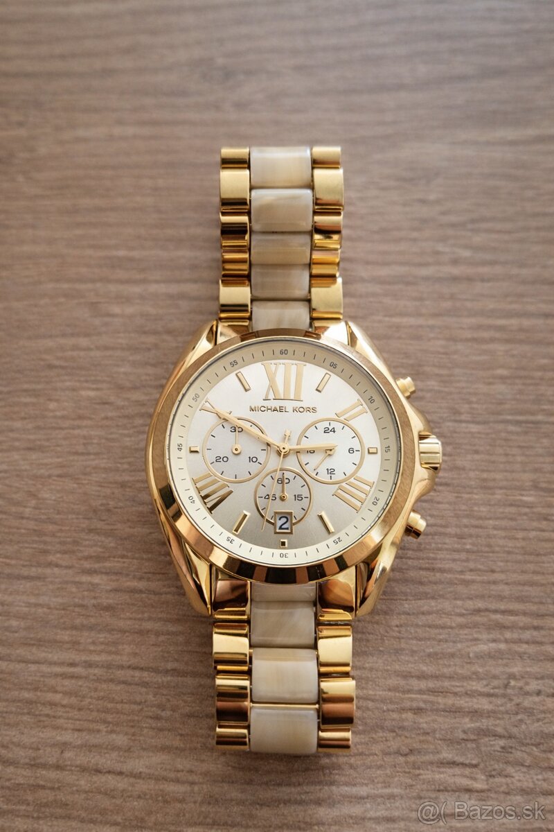 Predám elegantné dámske hodinky značky Michael Kors v krásnom zlato-bielom prevedení. Hodinky majú väčší ciferník s chronografom a dátumovkou, vhodné na bežné nosenie aj do spoločnosti.