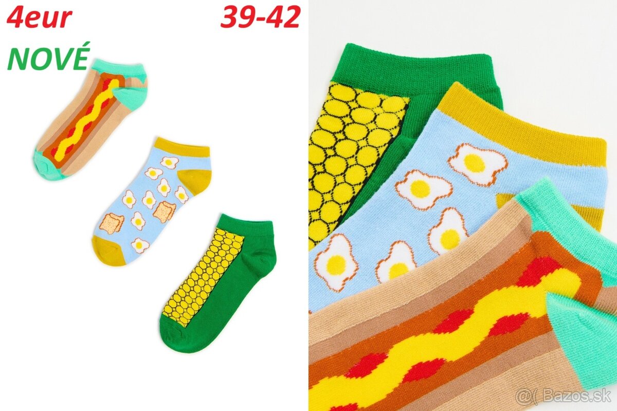 Predám členkové ponožky s motívom hot dog, volské oči, kukurica Cropp, veľkosť 39-42. Zloženie: polyamid 50%, bavlna 45%, elastan 3%, polyester 2%. Cena 4eur za 3-balenie.
