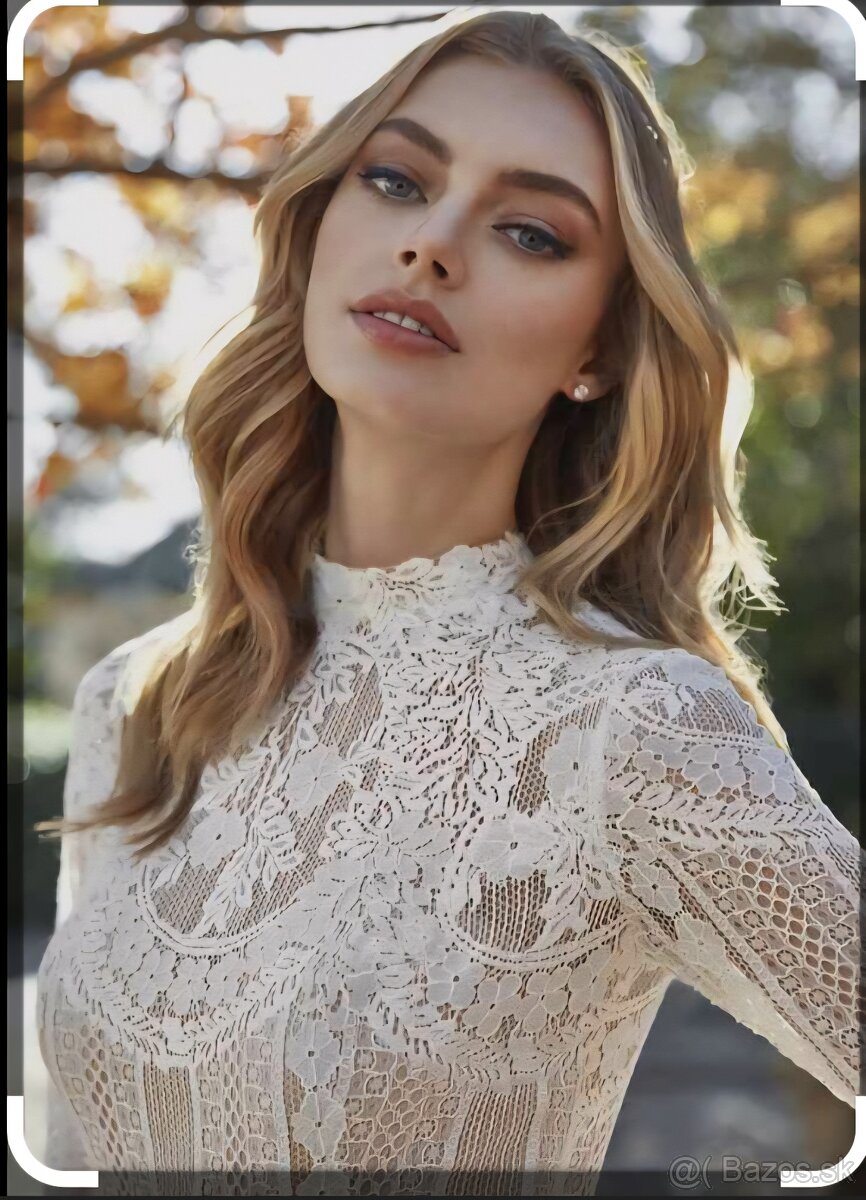 Svadobné šaty sa skladajú z ľahkého šifónu, saténu a paličkovanej krajky. Majú veľkosť 36. Začínajú sa na zips a gombíky. Originál model bez poškodenia.