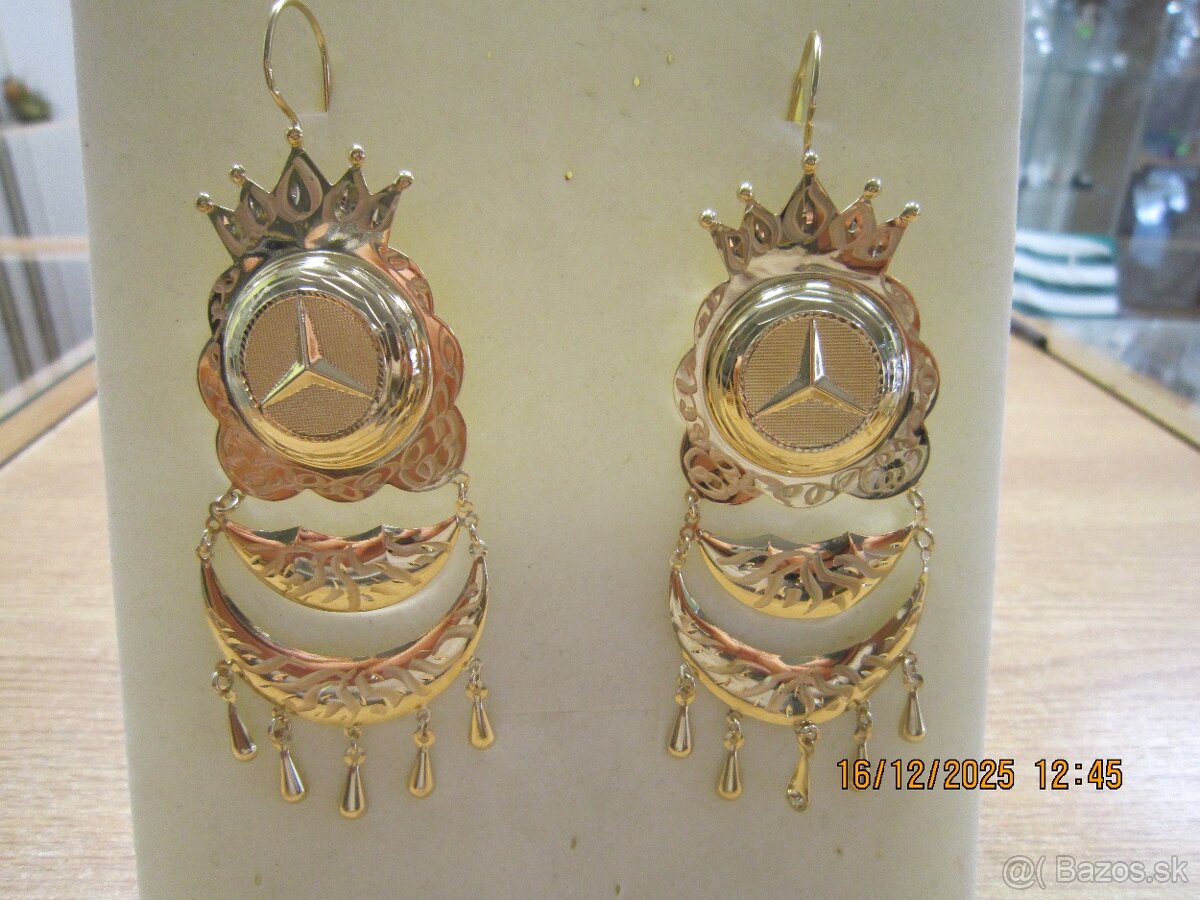 NÁUŠNICE ZLATO váha 12,64g - [18.4. 2026]Ponúkam na predaj výrazné náušnice 14 kt. zlato rýdzosť 585/1000, puncované. Výška 6,5 cm, šírka 2,5 cm. Znak Mercedes. Váha 12,64g, cena 1327,euro. Najlepšie je prísť osobne do Nových Zámkov. Môžem poslať aj na dobierku v poistenom liste. Poštovné je v cene. Pozrite aj moje ostatné inzeráty