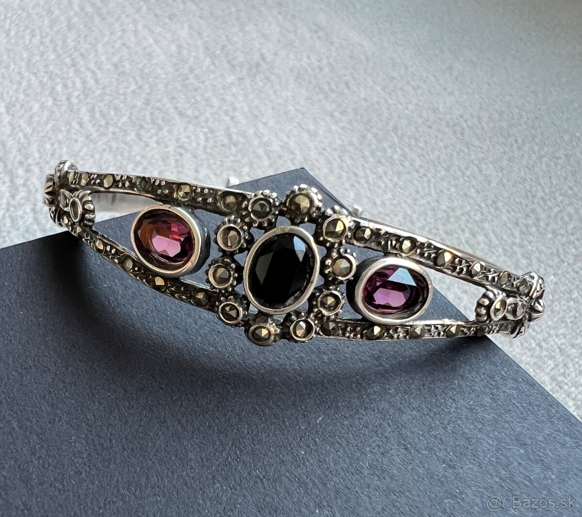 Strieborny naramok zo Spanielska, ma okolo 80 rokov , rucne vyrobeny sperkarom zo Spanielska. Je zo striebra , drobne kamienky su markazity . Je vo vybornom stave.
