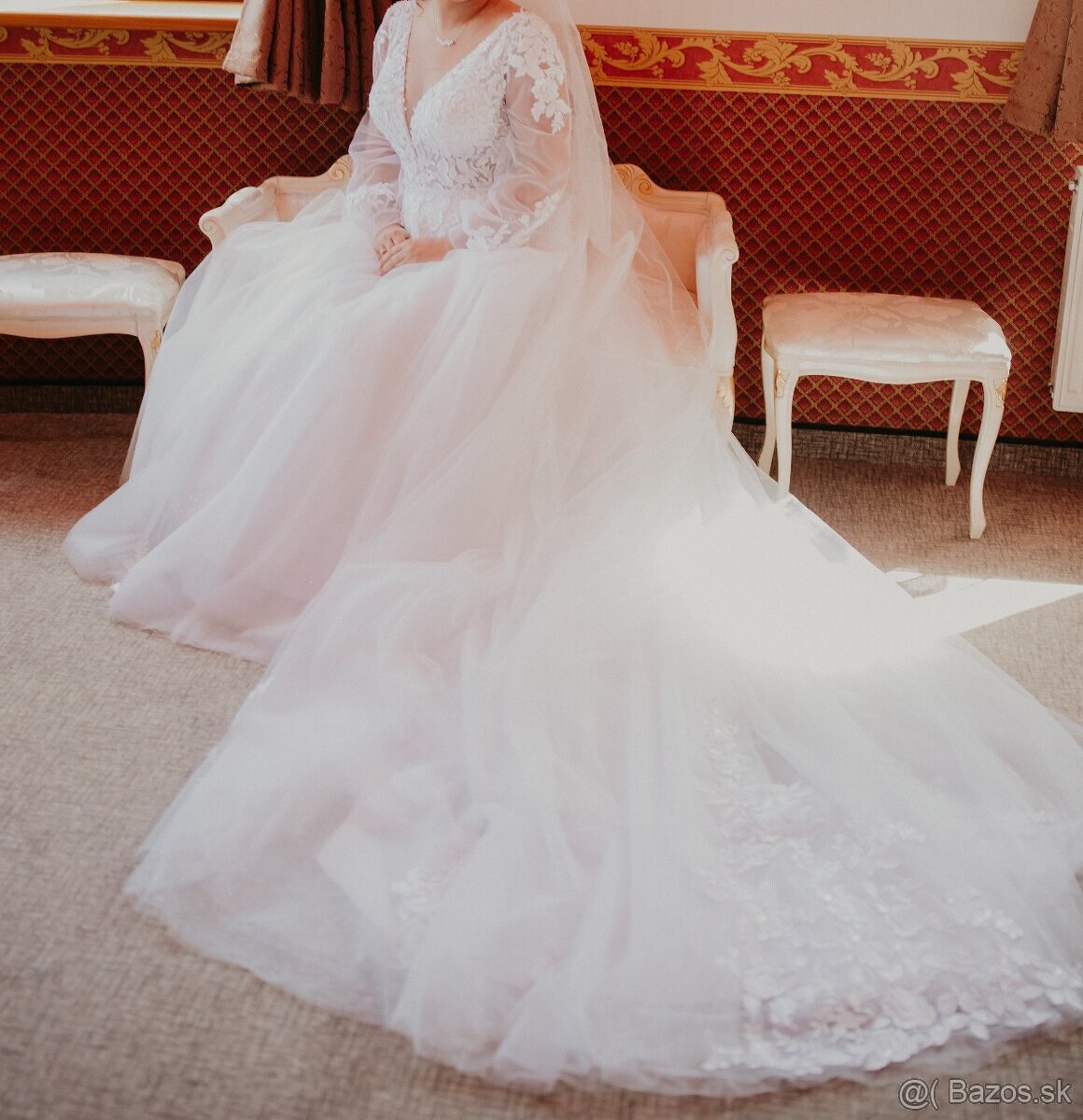 Predám krásne snehovo biele svadobné šaty s výstrihom a všitou podprsenkou, ktoré boli šité na mieru. Šaty majú šnurovacie zapínanie prekryté gombíkmi s odhaleným chrbtom a trblietavú vrstvu sukne s 1,5m dlhou vlečkou s nášivkami. Oblečené boli jedenkrát na svadbe a sú profesionálne vyčistené v čistiarni. Sedia na veľkosť cca 36/38 vďaka prispôsobeniu sa šnúrovačky a boli ušité na výšku 167cm + 8cm opätky.